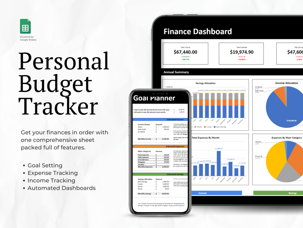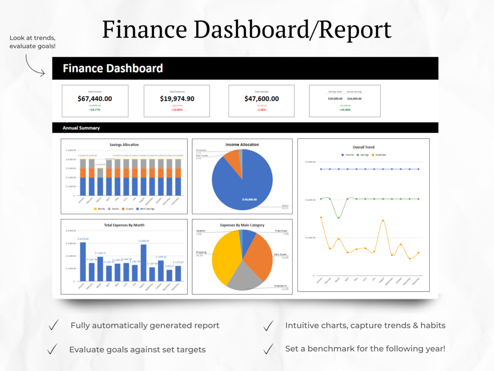 Record all your income and expenses. Put aside money for your savings and investments. Plan and set goals for the year and track your progress towards them. Review your finances with an automated dashboard breaking down all your money moves over the year.